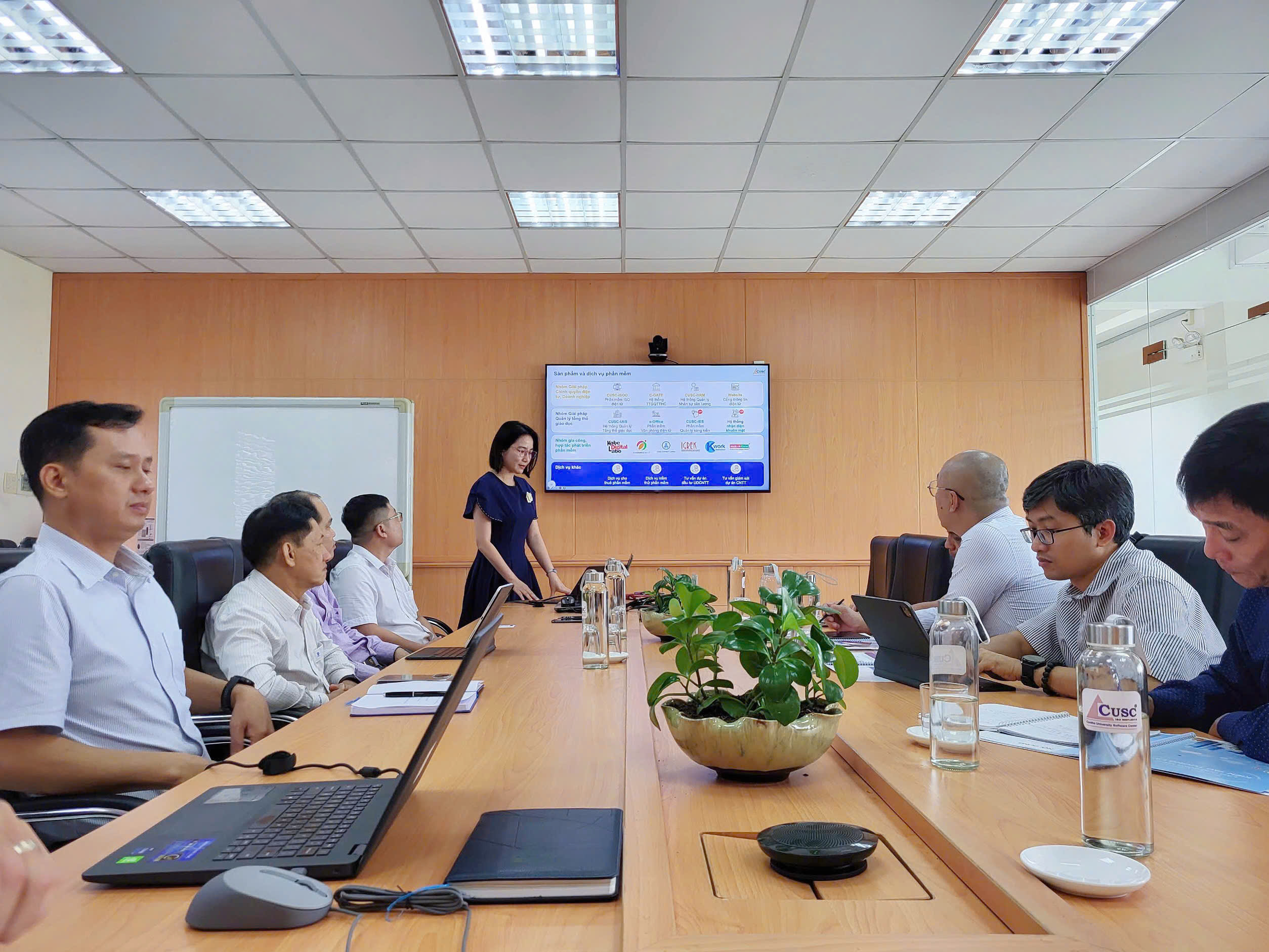 Tại buổi làm việc, CUSC đã giới thiệu tổng quan và demo các quy trình, chức năng của Hệ thống tích hợp thông tin Quản lý Đào tạo (CUSC-UIIS). Đại diện CUSC cũng đã giới thiệu chi tiết về các modules liên quan đến Chương trình đào tạo, Quản lý chuẩn đầu ra - giải pháp hỗ trợ nhà trường trong việc xây dựng, công bố chuẩn đầu ra, theo dõi mức độ đạt chuẩn đầu ra của người học, cũng như khai thác hệ thống báo cáo phục vụ công tác quản lý, tự đánh giá và kiểm định chất lượng.
